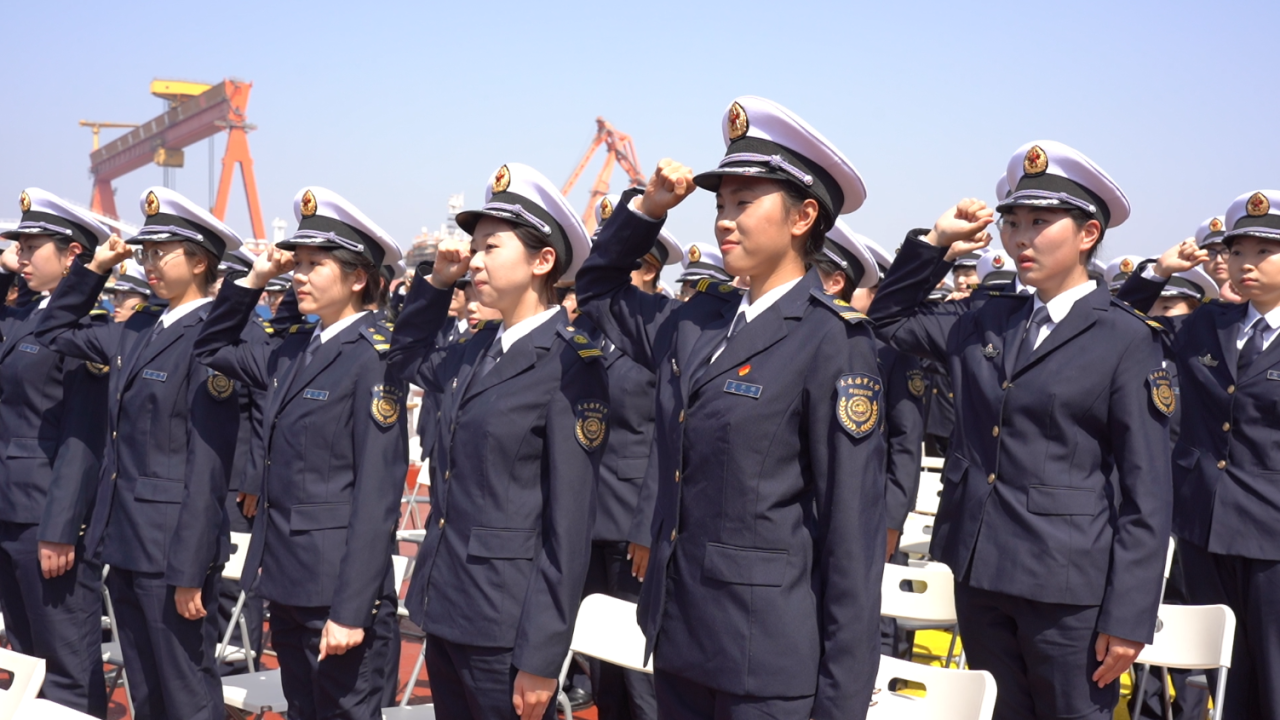 思政课的最后,“育鲲”轮全体师生庄严宣誓,以青春之名,立强国之志。“育鲲”轮拉响了汽笛,全体师生向两位老英雄敬礼。
